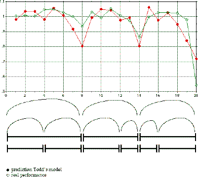 In this sheet the phrase structure indicated by our performers is shown, but other interpretations are possible. Each phrase and sub-phrase contributes its own curve. The combination of which is shown here, as is the real performance (with black dots). Now let us listen to this model.