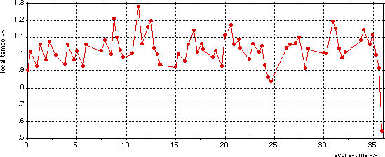 On the horizontal axis, score time is represented, on the vertical axis local tempo or velocity. One can see that this author connects the measurement points by a straight line. And, indeed, most timing or tempo measurements are presented in the form of a continuous curve instead of just a scattergram of measurements. These curves more or less imply an independent existence, apart from the rhythmic material from which they were measured. But one cannot perceive timing or tempo without events carrying it. The psychologist James Gibson even wrote an article called "Events are perceivable but time is not". And vise versa: "filling up" a time interval by adding an event between two measured points is problematic because it will change the perceived duration of the original interval.